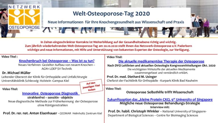 Welt-Osteoporose-Tag 2020 Neue Informationen für Ihre Knochengesundheit aus Wissenschaft und Praxis In Zeiten eingeschränkter Kontakte ist Weiterbildung auf der Gesundheitsebene richtig und wichtig. Zum jährlich wiederkehrenden Welt-Osteoporose-Tag am 20.10.2020 stellt Ihnen das Netzwerk-Osteoporose e.V. Paderborn wichtige und neue Informationen, mit Hilfe und Unterstützung von bekannten Experten der Osteologie, zur Verfügung. Neue Videos zu den Themen:…